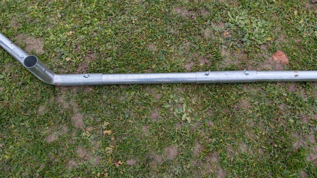 Sobald das Dachgerüst fertig aufgebaut ist, zieht man die Dachplane darüber und befestigt diese mit den Gummischlaufen um die Stangen.
