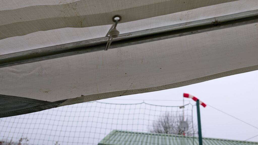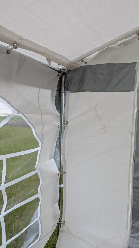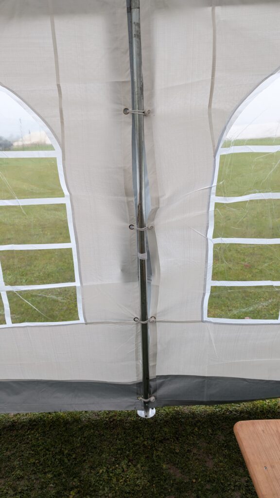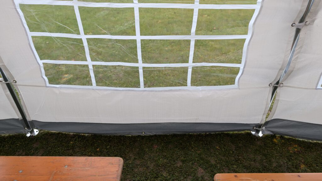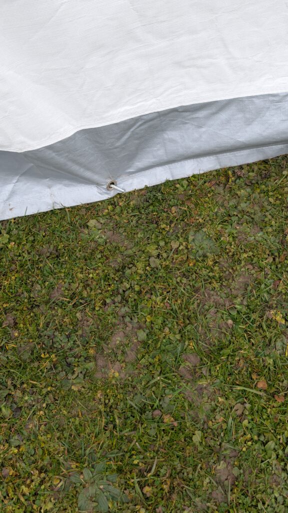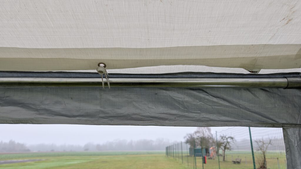 Die Dachplane wird wieder mit den Gummischlaufen um die Stangen befestigt und die Bodenfüße mit Heringen im Boden verankert. Die hängenden Seitenteile der Dachplane werden mit einem kleinen Haken in die Löcher der Seitenstangen eingehängt.