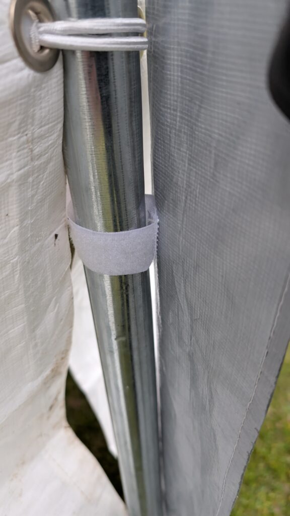 Die Abdeckungen der Dachplane an den Seitenpfosten werden mit dem Klettband angebunden.